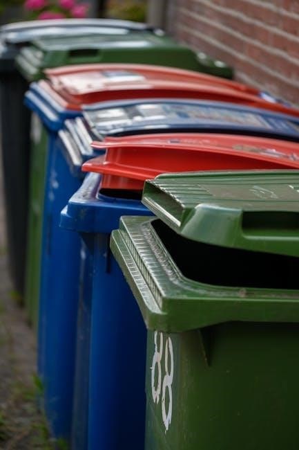Bins should be placed on a level surface to prevent tipping. Remove any obstructions‚ like vehicles or landscaping‚ that might block access for the collection truck. While not required‚ bringing bins in after collection helps maintain neighborhood aesthetics.